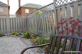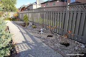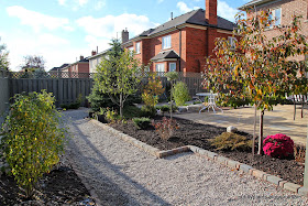 Dug out the two forsythia bushes today. Added new topsoil and mulch. Centred euonymous on a standard plant between the two crabapple trees. Put the juniper and red wine weigela into the ground. Will probably dig them back up in the spring for replanting at the front of the house. The interlock bricks are there to prevent the mulch from washing off during rain storms.